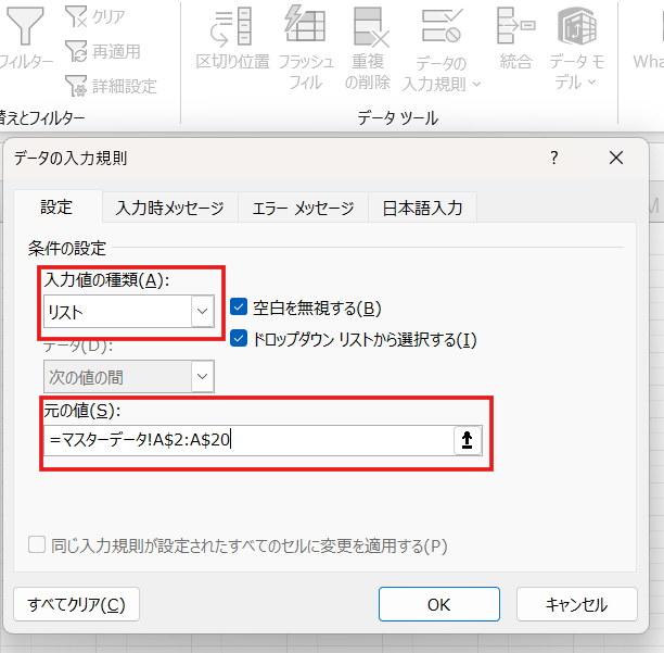 メイン表の担当者列(D列)を選択し、データタブ→データの入力規則→リスト→元の値に「=マスターデータ!A$2:A$20」と入力します。