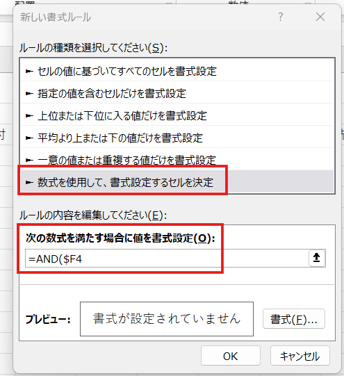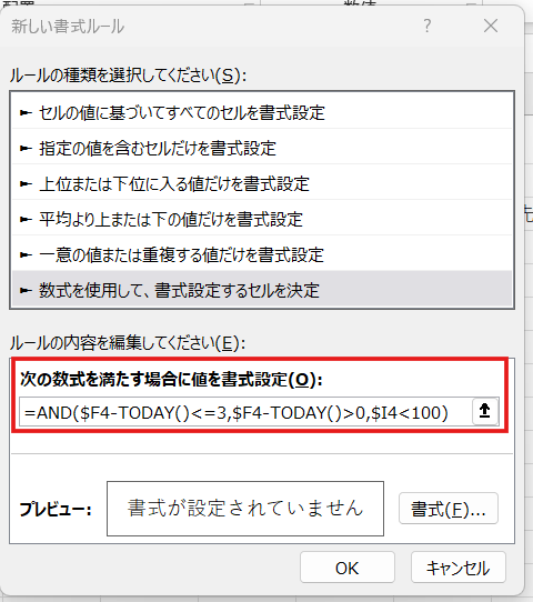 期限列を選択肢、=AND(A1″完了”)という条件で、背景を薄い赤(#FFC7CE)に設定します。
