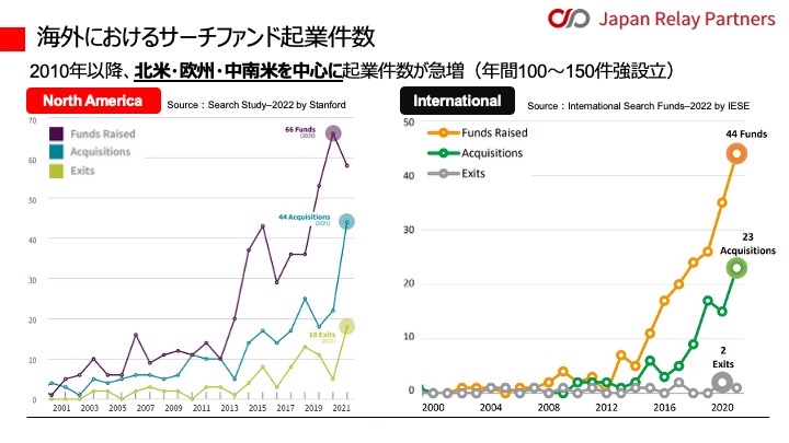 サーチファンドはもともとアメリカで生まれた仕組みですが、今ではヨーロッパや中南米にも広がりを見せています。特に2010年以降、その数は年々増加しており、年間100~150件ほどのペースで増え続けています。