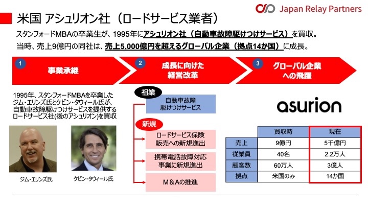 30年の歴史の中で最も成功したと言われるのが、アシュリオンのケースです。スタンフォード大学のMBAを卒業した2人組がサーチファンドを設立し、自動車駆けつけサービスを提供する中小企業を買収しました。彼らは自動車サービスだけでなく、保険販売や携帯電話故障事業など、多角化を積極的に行い、売上を9億円から5,000億円にまで伸ばしました。