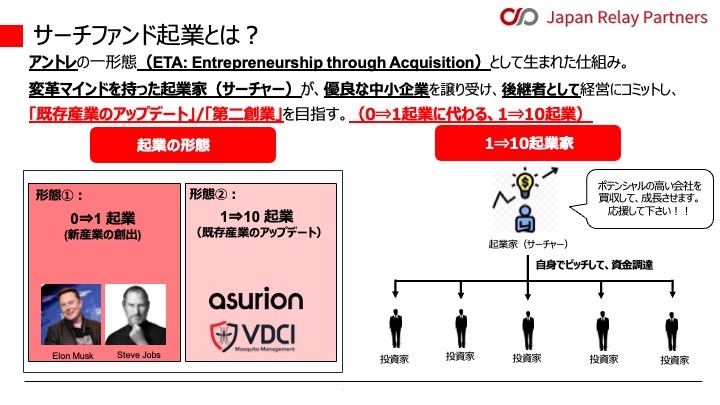 起業というと、イーロン・マスク氏やスティーブ・ジョブズ氏のような、ゼロから新しいプロダクトやサービスを生み出し、世界を変える「ゼロイチ起業家」を思い浮かべる方が多いと思います。これに対し、サーチファンドは「買収を通じた起業」という「1から10」にする起業形態であり、アメリカで開発されました。