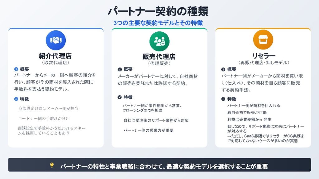 こうした契約モデルの選択は、パートナー企業のビジネスモデルや営業体制、自社製品との相性に応じて慎重に検討すべきです。