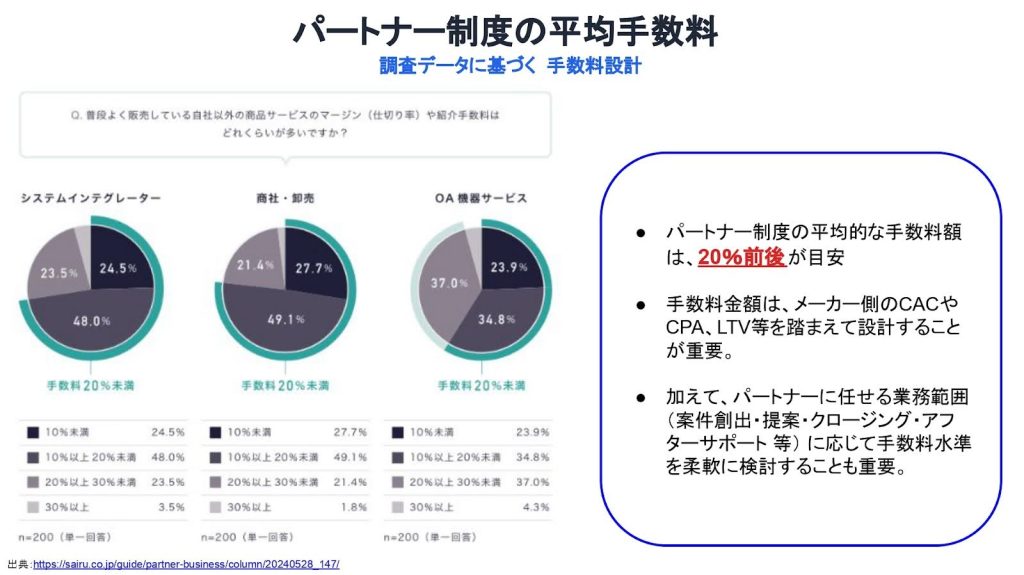 さらに重要なのは、「どこまでの業務をパートナーに担ってもらうのか?」という視点です。単なる案件紹介のみなのか、提案・クロージングまで含むのか、あるいは導入後のサポートまで含むのか。それぞれの業務範囲に応じて、手数料を柔軟に設計していくべきです。