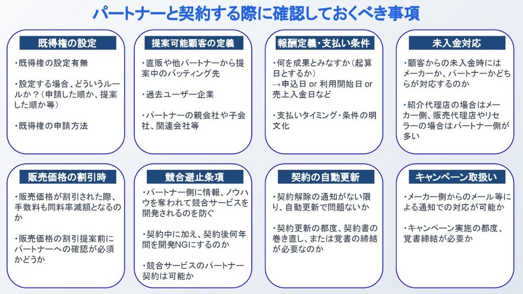以上のように、パートナー契約の形態や手数料体系は、パートナー企業の属性や商材の特性、販売戦略との整合性を見極めながら設計していくことが肝要です。