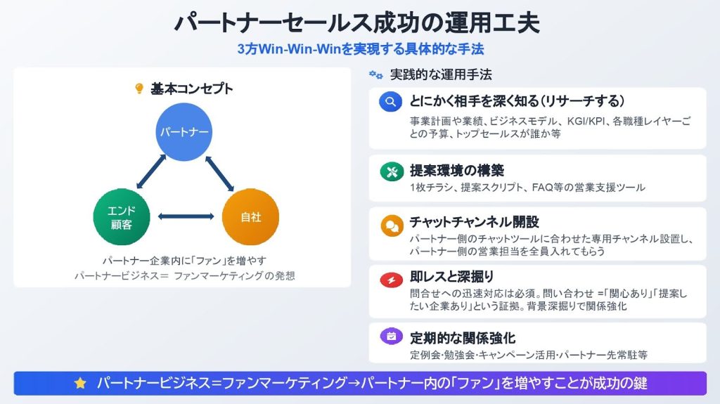結局のところ、パートナー企業の中にいかに自社や担当者のファンをつくれるかが、パートナーセールス成功の鍵だと考えています。そしてこの関係性は、単なる売上分配の話ではなく、パートナー、自社、そしてエンドユーザーの三者すべてにメリットがある「三方よし」の関係性をいかに築けるかにかかっています。