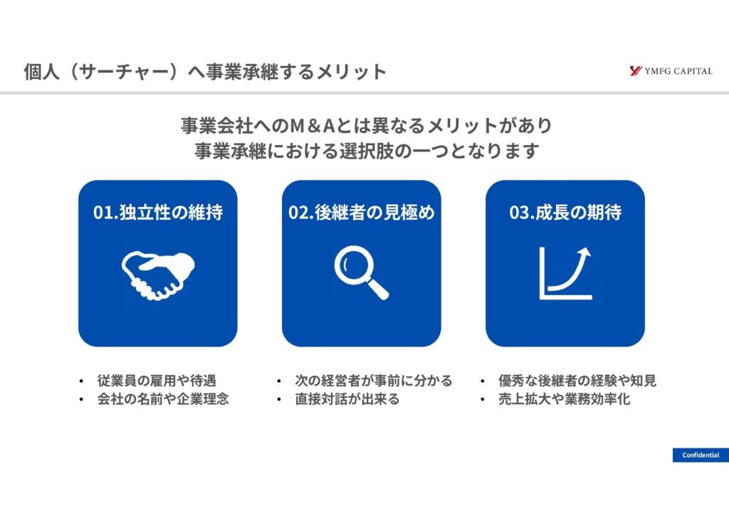 先ほど申し上げたとおり、弊社としては「単に事業会社に売却したくない」「長期的な視点で経営を引き継いで欲しい」といった、譲渡企業側の想いにしっかり応えていきたいと考えております。
