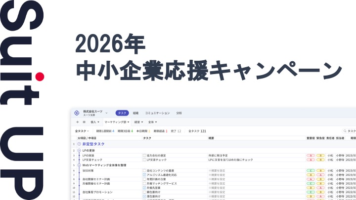 AIプロジェクト・タスク管理ツールの経営支援クラウド「スーツアップ」では、2026年4月1日から4月30日までの期間に「2026年中小企業応援キャンペーン」を実施いたします。