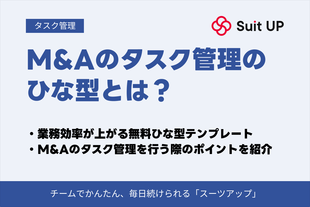 M&Aのタスク(M&A業務)とは何か、M&Aのタスク管理の課題、エクセルでM&Aのタスク管理を行う際のポイント、M&Aのタスクひな型がある「スーツアップ」、そして、M&Aのタスクひな型の紹介について説明します。