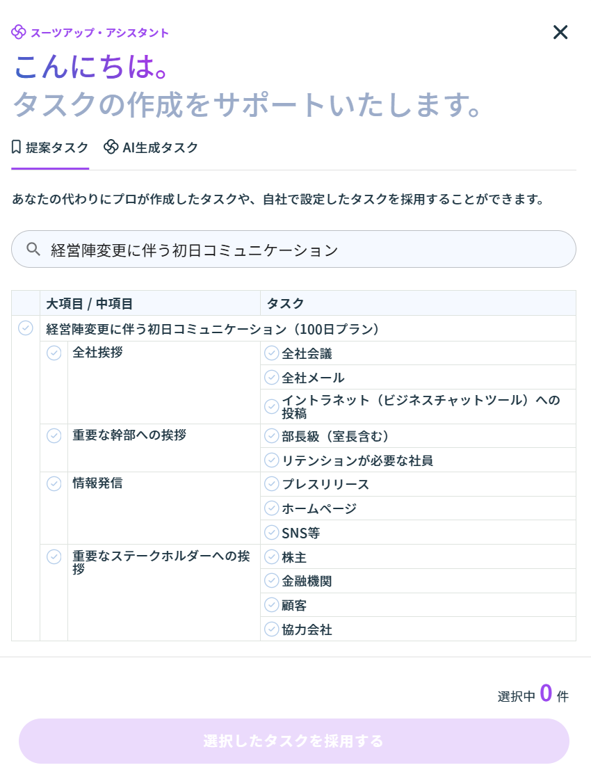 経営陣変更に伴う初日コミュニケーションのタスクのひな型は、全社挨拶、重要な幹部への挨拶、情報発信、重要なステークホルダーへの挨拶などのチェック項目があります。