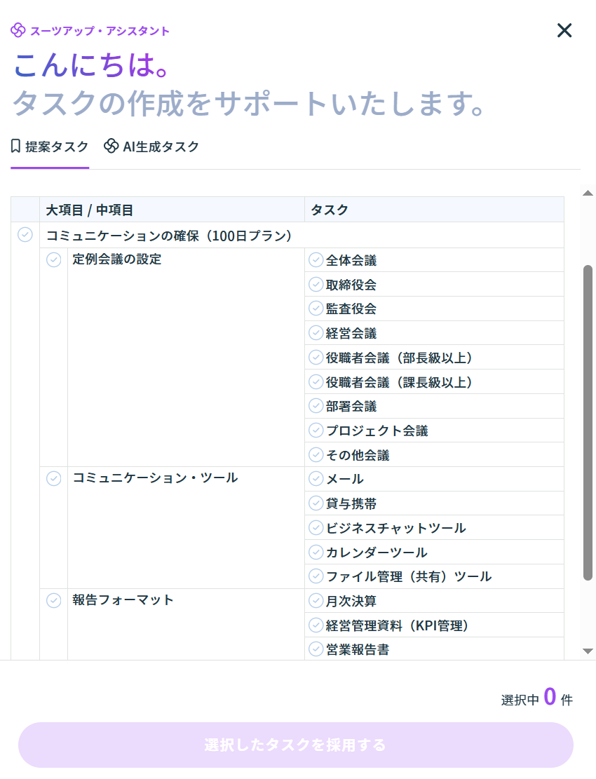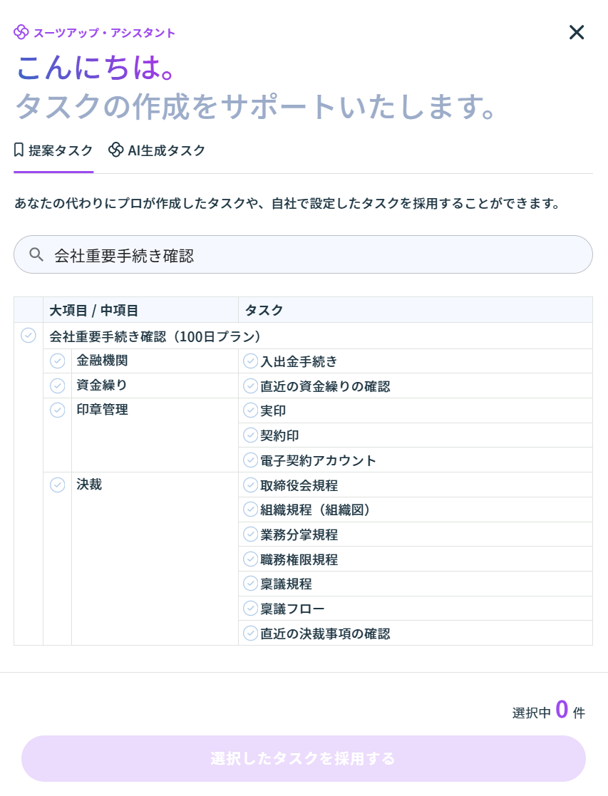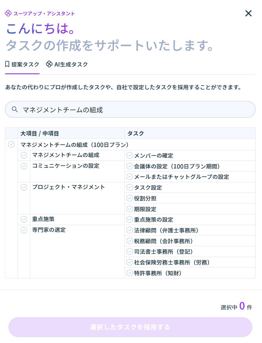 経営支援クラウド「スーツアップ」はそのようなツールの一つで、あらかじめ用意されたM&Aのタスクの無料のテンプレートがあり、初心者でも簡単に使い始めることができます。