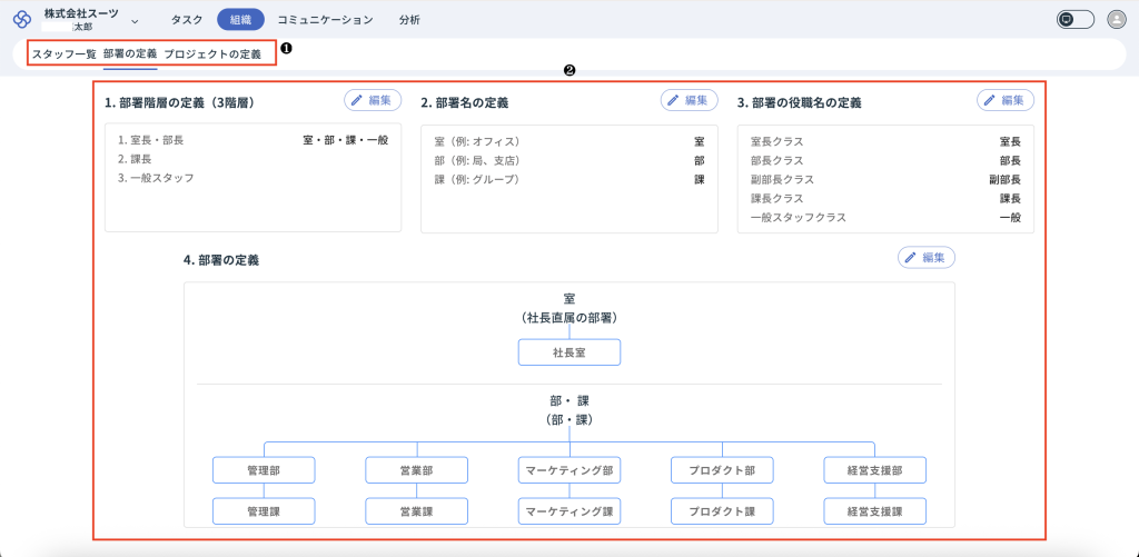 スーツアップでは、「組織」画面で、ワークスペースの「部署階層の定義」・「部署名の定義」・「部署の役職名の定義」・「部署の定義」の「部署の定義」、「プロジェクトの定義」や「スタッフ一覧」を設定できます。