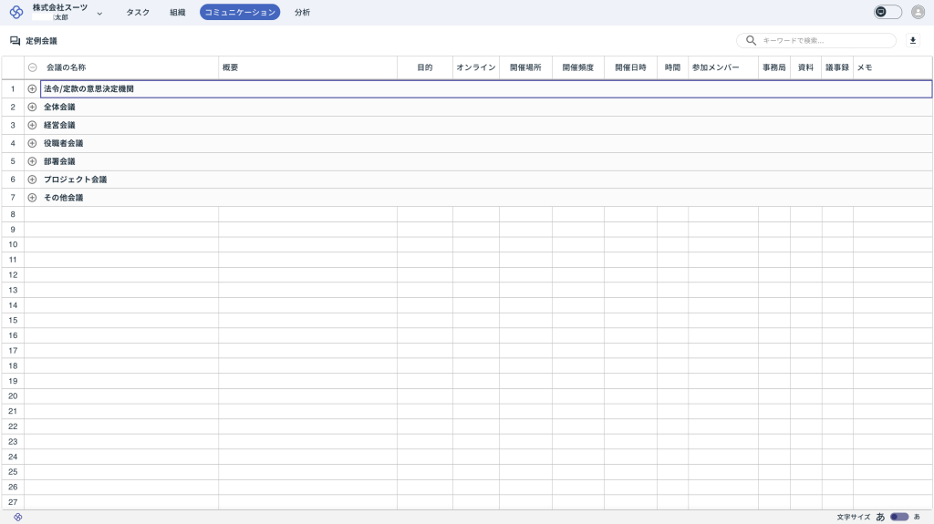 スーツアップでは、ワークスペースの定例会議を「法令/定款の意思決定機関」、「全体会議」、「経営会議」、「役職者会議」、「部署会議」及び「その他会議」に分類して会議情報を設定できます。