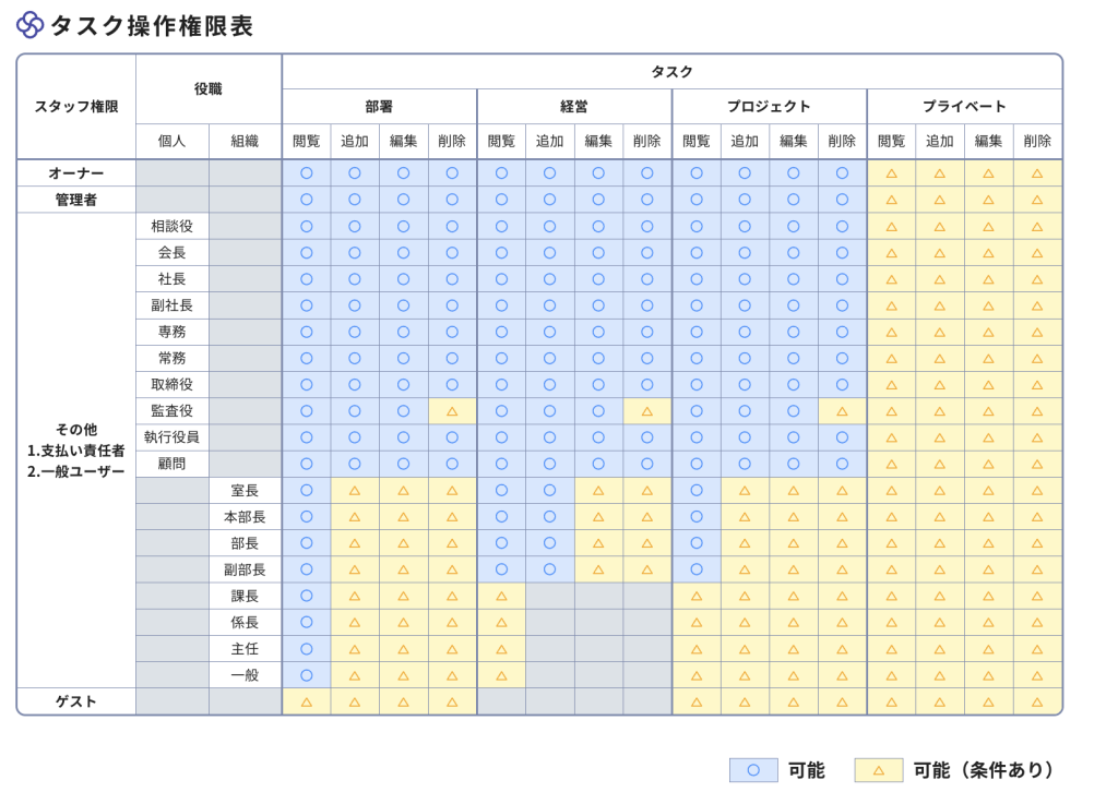 スーツアップでは、下記にある「タスク操作権限表」に基づいて、タスクの閲覧、設定、編集や削除などを行うことができます。スーツアップの特徴は、会社組織に紐づいたタスク管理ツールです。そのため、例えば自分が所属していない他の部署の部署タスクは閲覧しかできず設定、編集や削除はできない、一般スタッフは経営タスクは閲覧しかできず設定、編集や削除はできないなどのように常識的な組織のルール・権限に従って、タスク管理ができるようになっています。また、ゲストは経営タスクを閲覧、編集及び削除はできません。これらは一般的な組織の権限設定なのですが、もし現在の会社組織そのままでスーツアップを使用し権限で不都合が生じている場合は、一時的に、その担当者を「管理者」とし権限を上げて対応することを推奨しています(前述のとおり、このような場合は、このタイミングで組織の整理・改変をご検討いただくことを推奨しています。)。例えば、スタートアップでよくある事例ですが、役職と実態が乖離しており、古参社員が役職に就いているもののスタートアップの事業の成長スピードについていくことができず、なぜか中途採用で入社した社歴の浅い一般スタッフが社長とともに経営タスクをこなしてしまっているなどがあります。しかし、もちろん、この状況が続くことは会社として決して望ましいものではなく、その優秀な一般スタッフを「管理者」にして経営タスクの設定、編集や削除をできるようにすることは一時的な問題解決でしかありません。会社としては、役職と実態の乖離という、根本的な組織の問題解決と向き合わなければならないのです。