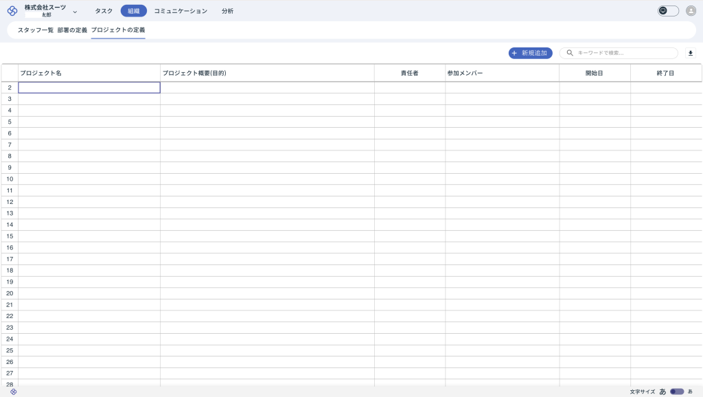 「スタッフ一覧」及び「プロジェクトの定義」については、セルの集合体で構成されたタスク入力領域です。「部署の定義」については、専門的な知識がないスタッフであっても組織設計ができるように、組織設計に最適化された入力方法をご用意しています。