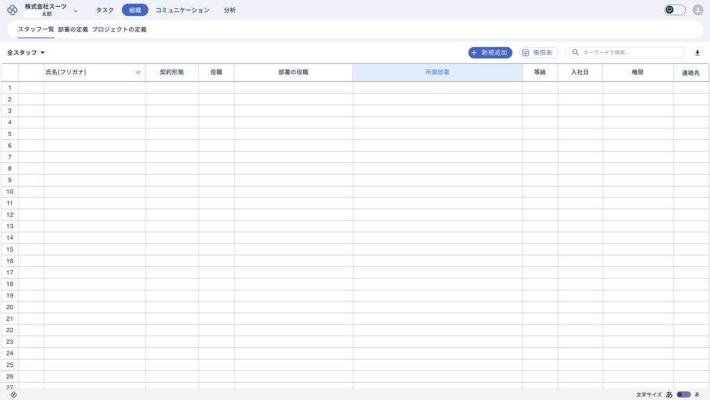 ワークスペースに所属するスタッフ及びそのスタッフの情報の登録ができます。「スタッフ一覧」画面では「氏名」、「契約形態」、「役職」、「部署の役職」、「所属部署」、「等級」、「入社日」、「権限」及び「連絡先」が表示されます。また、「スタッフ一覧」画面左上の+(プラス)ボタンをクリックすると「スタッフの新規追加」、そして、スタッフ情報の記載された行でクリックをすると「スタッフの編集」がポップアップで表示され、スタッフの情報の登録・編集ができます。