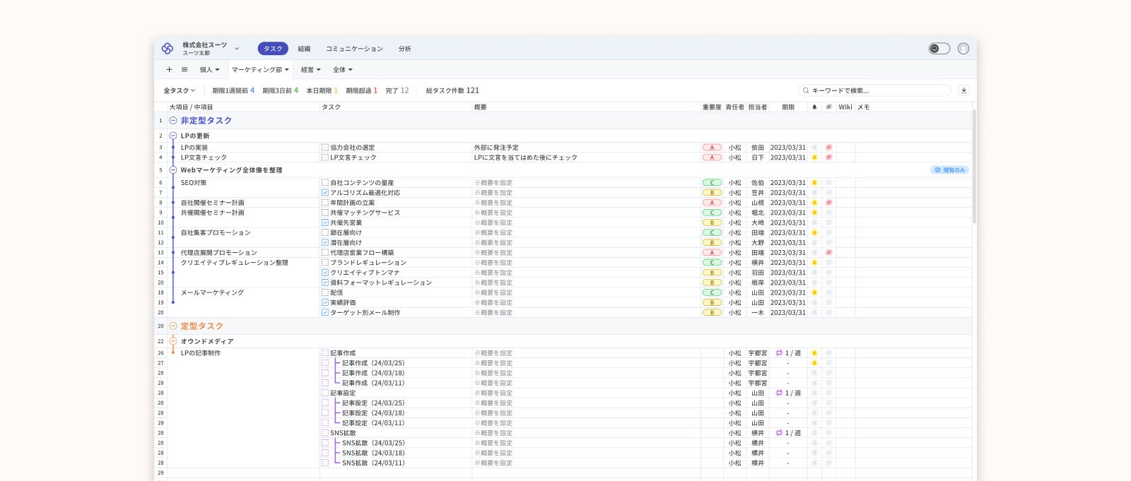 スーツアップでは、2023年9月からα版、2024年4月からβ版の提供をしています。β版では、タスク・組織・コミュニケーション及び分析の基本機能に加えて、表計算ソフトにはないタスク雛型、期限通知及び定型タスクなど、チームでのタスク管理をかんたんに毎日続けられる機能が搭載されました。