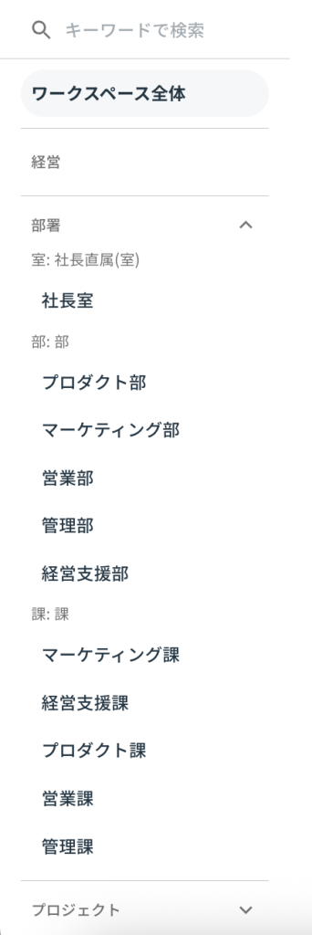 分析対象とは、ワークスペースの「部署」「プロジェクト」「ユーザー」などのタスク分析の対象です。分析対象を設定する場合には、タスク分析画面の左側にある「ワークスペース全体」「経営」「部署」「プロジェクト」「ユーザー」から選んでください。「部署」「プロジェクト」「ユーザー」から選ぶ場合には、プルダウンから分析対象をクリックしてください。また、検索欄から「キーワードで検索」をすることで、分析対象をかんたんに選ぶこともできます。