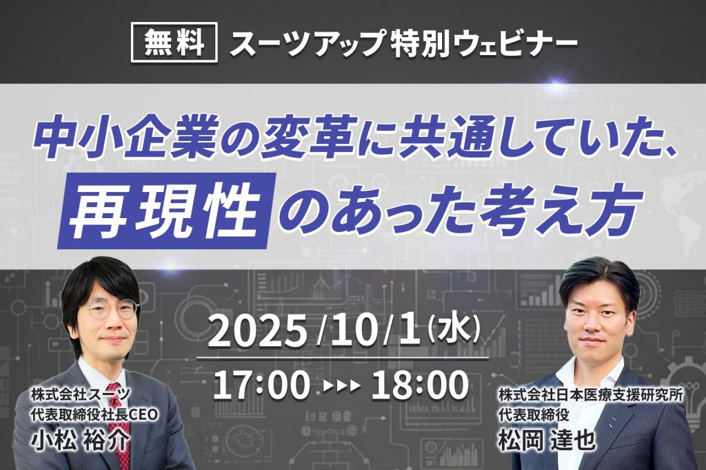 株式会社スーツ(所在地:東京都千代田区、代表取締役社長CEO:小松 裕介)は、2025年10月1日(水)17時から、ゲスト講師に、株式会社日本医療支援研究所 代表取締役 松岡 達也氏を迎え、第17回となるスーツアップ特別ウェビナー「中小企業の変革に共通し... -